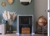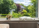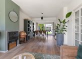 Een ruime, lichte woonkamer met uitzicht op de dijk én een gezellige haard