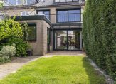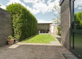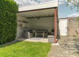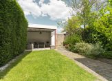 De achtertuin is een fijne mix van gras, groen en terras. Achterin is een gezellige overkapping gecreëerd waar je heerlijk beschut kunt zitten. Via de poort kom je bij de garage, die uitkomt op een pleintje – ideaal voor extra parkeergelegenheid of als handige berging.