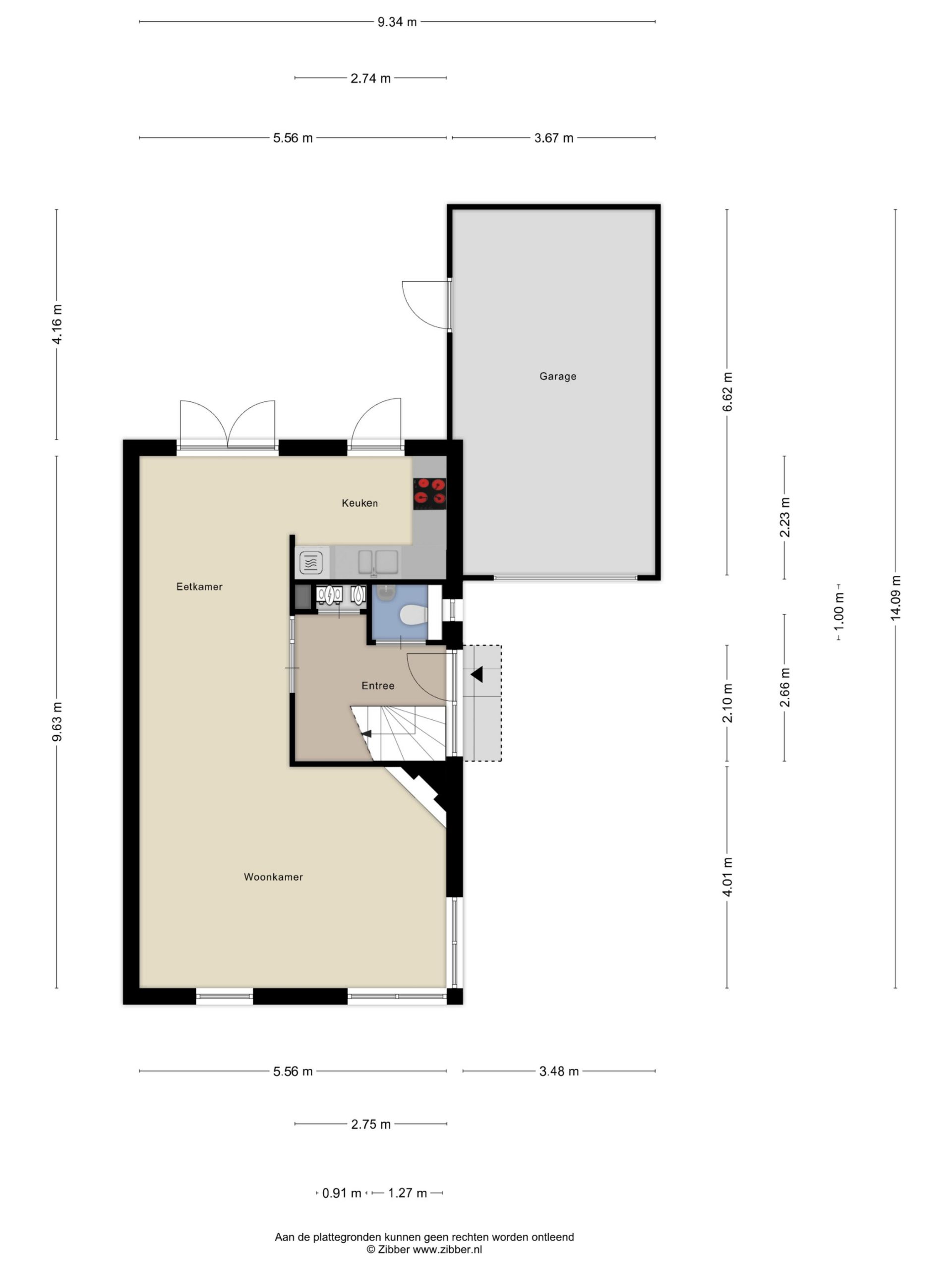 * Aangebouwde stenen garage met loopdeur en elektrische overheaddeur;