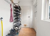 Entree / hal met meterkast. Open keuken, woonkamer, ruime berging met mogelijkheid tot het opbergen van spullen op een kleine vliering, slaapkamer, badkamer met wastafel, wc en douche.