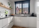 Begane grond: Entree met hal, meterkast en modern toilet met fonteintje. Vanuit de hal stap je de ruime L-vormige woonkamer binnen. Deze is voorzien van een trapkast en heeft toegang tot de tuin op het noordwesten. De stijlvolle visgraatvloer met vloerverwarming maakt het geheel compleet. De moderne open keuken is volledig uitgerust, met o.a. een inductie kookplaat, afzuigkap, vaatwasser, Quooker, koelkast, vriezer, oven én magnetron.