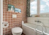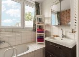 * badkamer met zijdelings uitzicht op de fiets- en spoorbrug, met kunststof dakkapel uit 2023 en voorzien van drie draai-/kiep ramen HR glas, gemoffeld marmer op vloer en achterwand van toilet. Bad, wastafel, handdoekradiator en toilet.