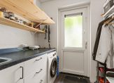 Voordeur aan de Rijksweg: entree / gang / toilet / sta-hoge kelder ca. 6 m2 / woonkamer met veel (HR) glas ramen. Open keuken met hardstenen blad, apparatuur, kookeiland met extra kraan, gootsteen en stopcontacten. Aan de woonkamer grenst een ruime serre op het zuidwesten, met aan de binnenkant een op afstandbedienbaar zonnescherm en dimbare spotjes. Bijkeuken met een keukenblad, vloerverwarming, warmwateraansluiting, wasmachineaansluiting en een deelbare kunststof buitendeur met HR glas aan de Maaszijde. Badkamer heeft een lichtkoepel, inloopdouche, wastafel, wastafelmeubel, tweede toilet en vloerverwarming.