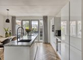 Indeling: Entree / hal / meterkast (11 groepen + krachtgroep, glasvezel, stadsverwarming) / toilet met inbouwreservoir, fontein en vloerverwarming / uitgebouwde woonkamer (1,20 m) met eiken houten vloer in visgraat motief tappies gelegd / trapkast met verdeler vloerverwarming en provisieruimte / keuken met kunststof aanrechtblad, kookeiland met AEG inductiekookplaat met geïntegreerde afzuiging, koel-vriescombinatie, Siemens combi-oven, vaatwasser en wijnkoelkast / vanuit de woonkeuken openslaande deuren naar de achtertuin / fraai aangelegde achtertuin met houten berging met elektra, buitenkraan, achterom en toegang tot royale parkeerplaats.