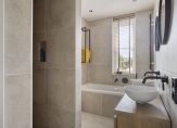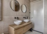 1e verdieping: Overloop met vaste trap naar 2e verdieping / 3 slaapkamers met laminaat vloer en gladde wandafwerking / luxe badkamer voorzien van kunststof ligbad met inbouwkraan, inloopdouche met inbouwkraan en regendouche, 2e toilet met inbouwreservoir, eiken wastafelmeubel met 2 waskommen en inbouwkranen en designradiator.
