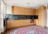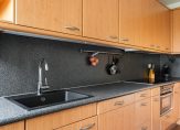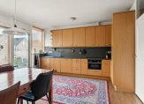 Op de eerste verdieping is de keuken en de deur naar het balkon. De keuken beschikt over een lange opstelling en is voorzien van alle denkbare apparatuur. De keuken is groot genoeg voor een flinke eettafel en kent nog een ruimte welke dient als opslag. Hier bevinden zich ook de aansluitingen voor de was- en droogmachine.