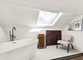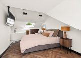 Op de bovenste verdieping tref je een ruime overloop met dakkapel, dakraam, inbouwkasten en aansluitingen voor wasmachine en droger. De ruime slaapkamer met dakkapel is voorzien van extra bergruimte én een heerlijk ligbad – perfect voor ontspanning.