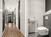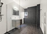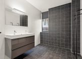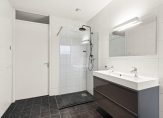 De badkamer is netjes afgewerkt. De badkamer heeft een dubbele regendouche met handdouche, een vaste dubbele wastafel met spiegel. Dit geldt ook voor de separate toiletruimte, welke is ingericht met een zwevend closet en een fonteintje.