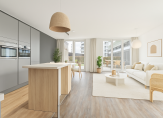 De living van ca. 40 m2 met open keuken kent door de vele raampartijen een prachtig uitzicht op de Waal, de binnentuin en de Waalhaven. De totale ruimte is open, heeft een fijne verdeling van koken, eten, genieten en relaxen. Aan de voorzijde heeft het appartement een ruim dakterras. Verder beschikt het appartement over een eigen parkeerplaats (optioneel) en een aparte berging in de onderbouw.