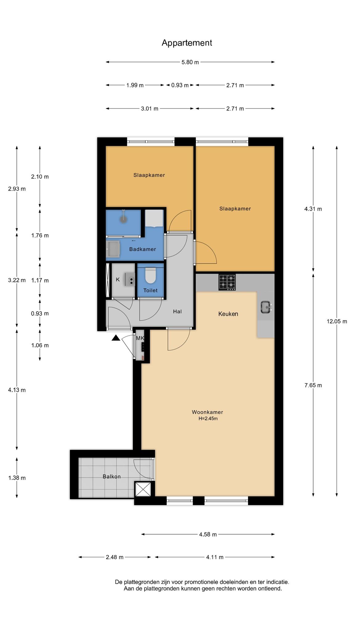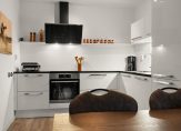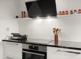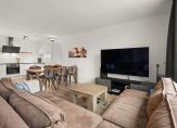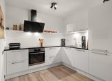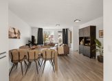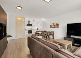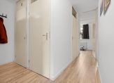 Entree van het appartement met een hal, bergingskast en apart toilet. Ruime woonkamer met veel lichtinval en een open L-keuken voorzien van luxe inbouwapparatuur. Vanuit de woonkamer is het zonnige balkon bereikbaar.