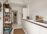 De keukenruimte heeft raampartijen over de hele breedte waardoor je veel lichtinval hebt én een prachtig uitzicht. Je loopt vanuit de keuken rechtstreeks het balkon op. Ook is er een toegang naar de woonkamer met twee inbouwkasten en een originele schouw.
