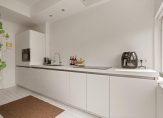 1e verdieping: moderne toiletruimte met hangend closet, fonteintje en buitenraampje. De strakke keuken, uitgevoerd in een frisse wittint met een extra diep aanrecht bevindt zich aan de achterzijde van de woning en is voorzien van een inductiekookplaat, vaatwasser, koel/vriescombinatie en oven.