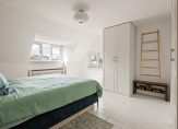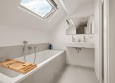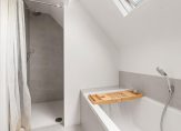 2e verdieping: via een vaste trap bereik je de 2e verdieping en kom je op de overloop. Deze geeft toegang tot de fraaie badkamer met inloopdouche en ligbad, een brede wasbak met twee kranen, grote spiegel en een dakraam.