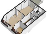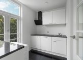 De keuken is voorzien van voldoende werkruimte met alle denkbare inbouwapparatuur zoals een inductiekookplaat, inbouwkoelkast, wasmachine en vaatwasser. De slaapkamer ligt aan de voorzijde en de badkamer heeft een inloopdouche en wastafel. Het toilet zit apart van de badkamer. Deze bevindt zich in de hal. Het dakterras ligt op het westen en is via openslaande deuren te bereiken via de achterste(woon)kamer. Het dakterras is met hardhouten planken bedekt.