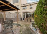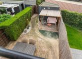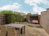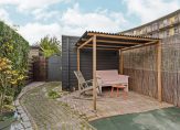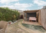 Vanuit de woonkamer is er toegang tot de achtertuin op het zuiden. De achtertuin beschikt over een vrijstaande houten berging en een achterom.