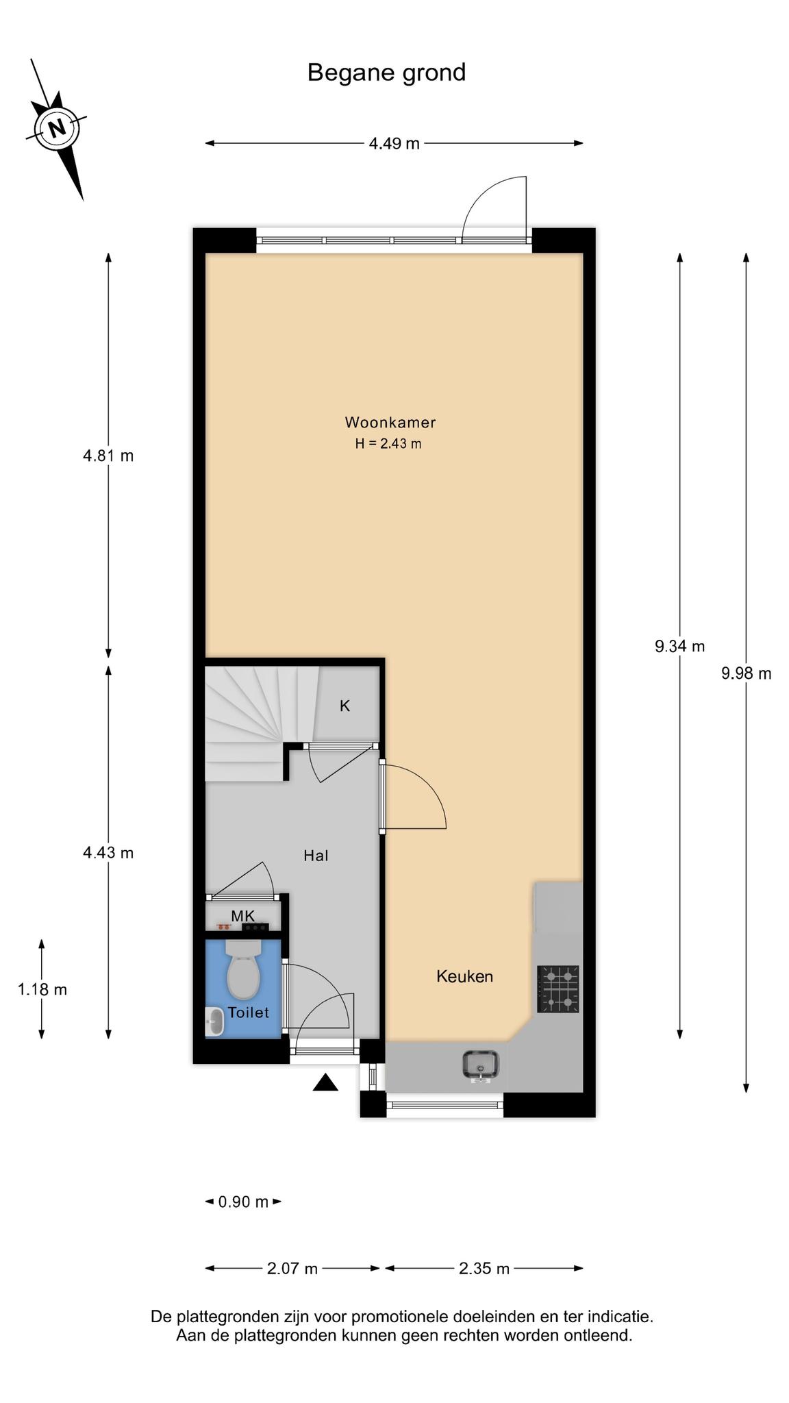 Entree, hal met toilet en fonteintje, meterkast en trapopgang met trapkast. Woonkamer met open keuken in L-vorm. De keuken beschikt over diverse inbouwapparatuur en de woonkamer is ook voorzien van vloerverwarming.
