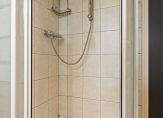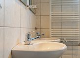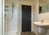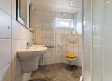 De badkamer is compleet uitgevoerd met twee vaste wastafels, een toilet en een douchecabine.