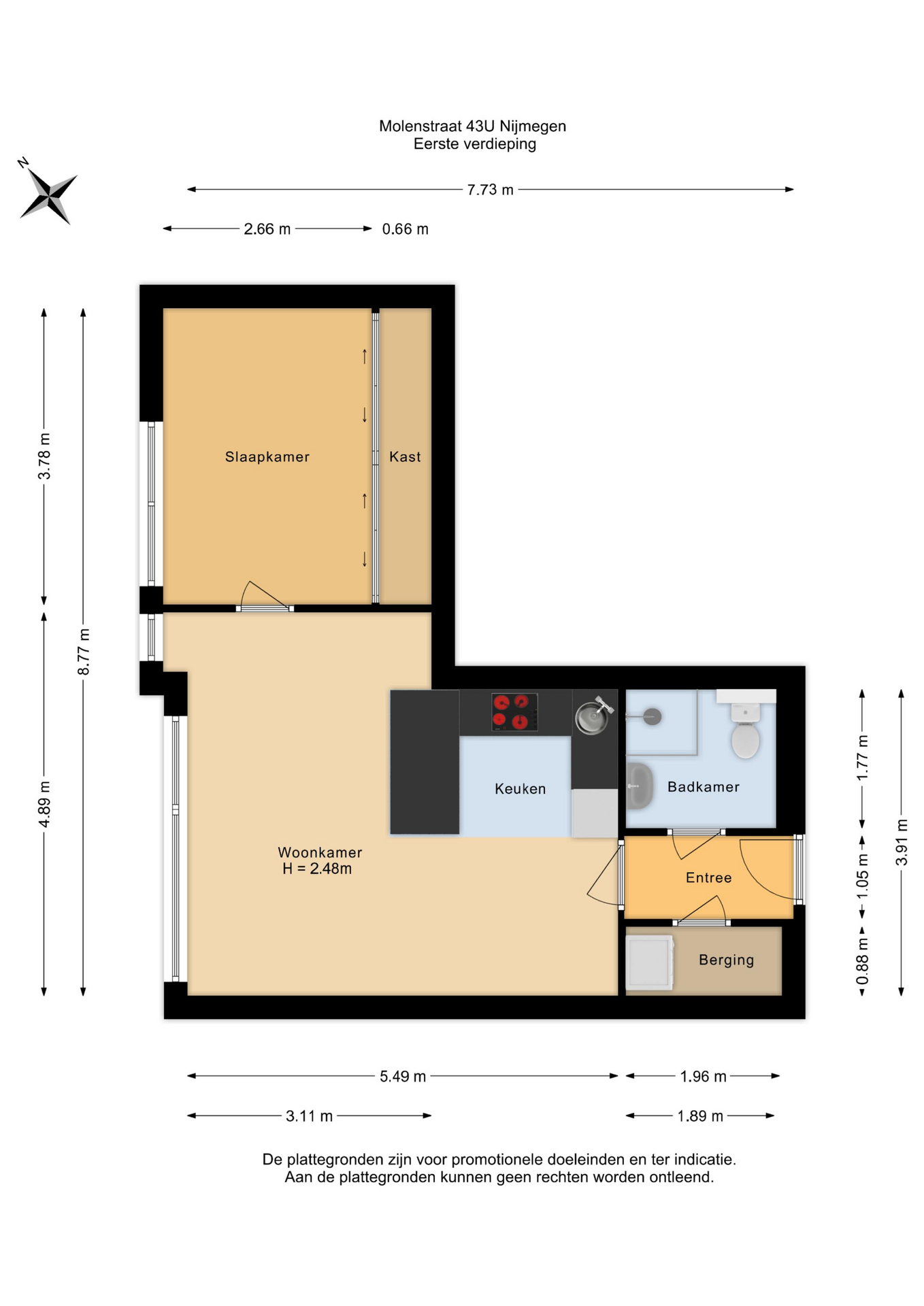 Entree, hal, badkamer met een toilet, douche en vaste wastafel, berging met witgoedaansluiting, ruime lichte woonkamer waar je kan genieten van uitzicht op de Stevenskerk en de stadsbrug. Daarnaast beschikt het over een moderne open keuken met gezellige bar en diverse inbouwapparatuur en een aparte slaapkamer met een vaste kast.