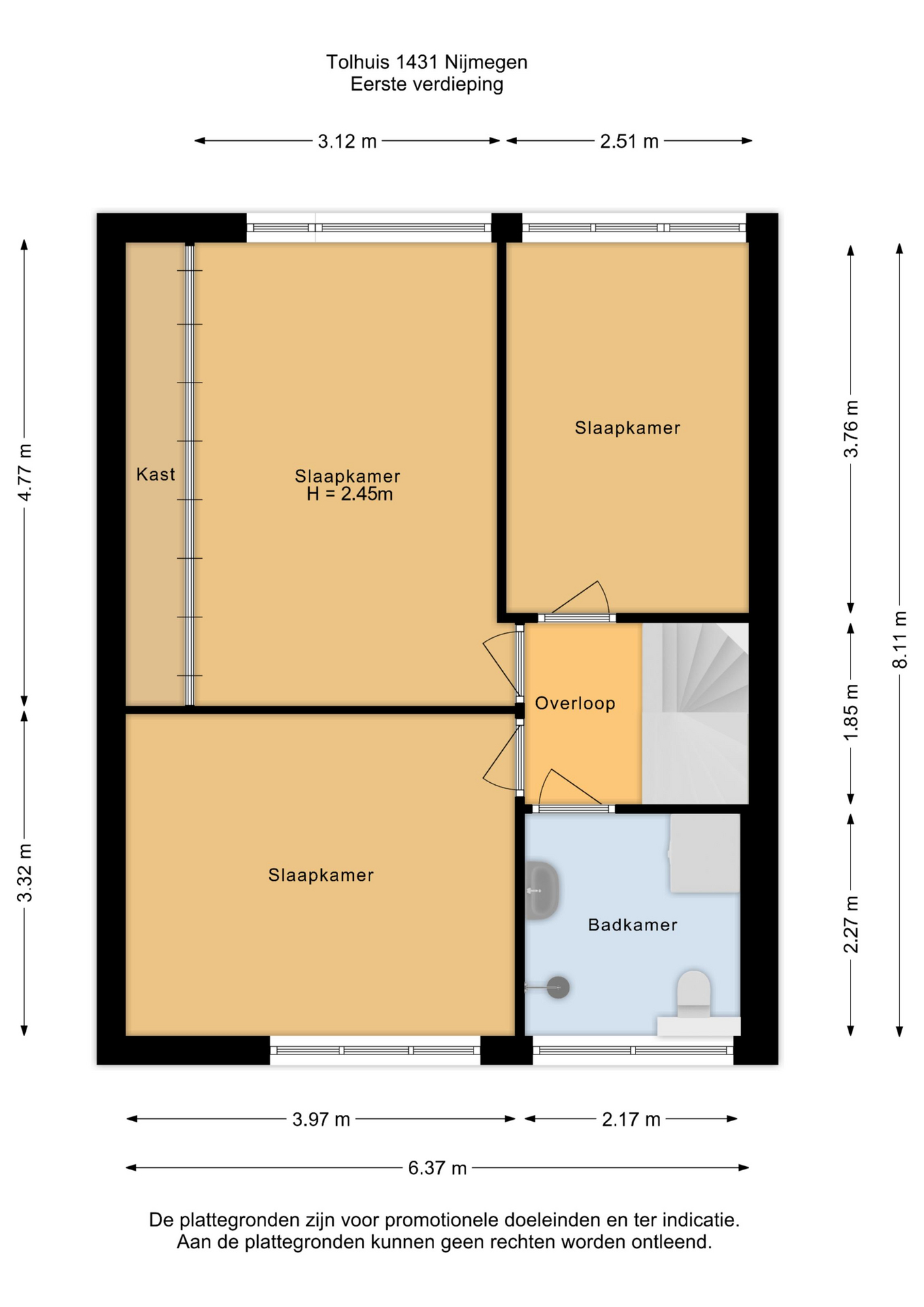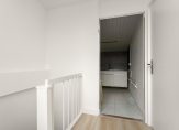 Op de eerste verdieping bevinden zich drie slaapkamers, waaronder één met een ingebouwde kast. De kamers zijn praktisch in te delen en geschikt als slaap-, werk- of logeerkamer. De nette badkamer is voorzien van een wastafel, toilet en douche.