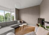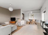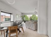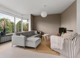 De woonkamer is licht en royaal, met voldoende ruimte voor een comfortabele zithoek en een eettafel. Grote raampartijen zorgen voor veel natuurlijk licht.