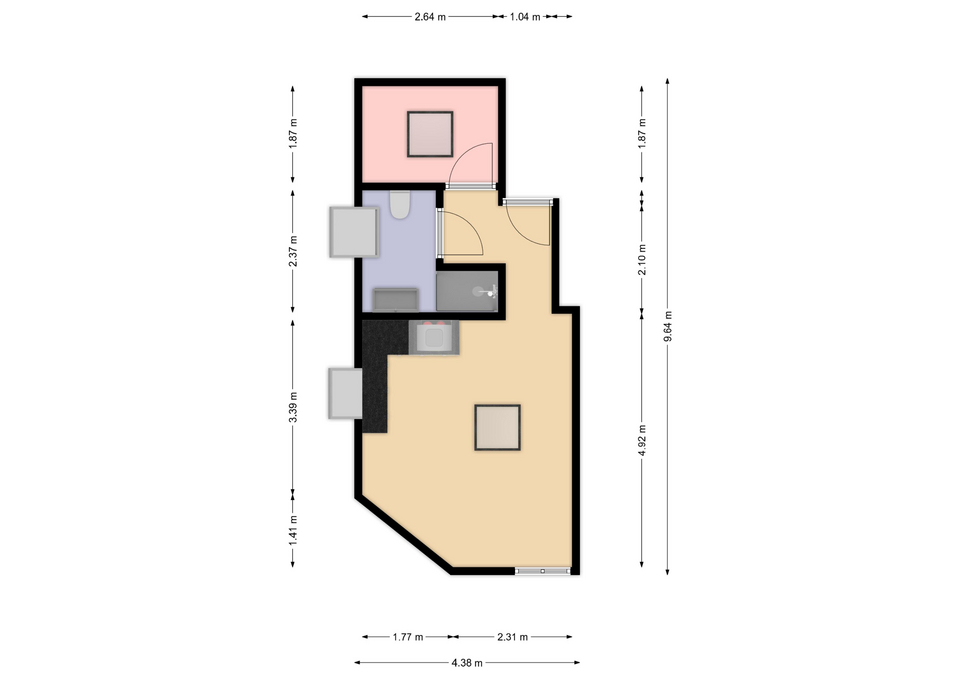 Het appartement heeft verder een slaapkamer en een badkamer met een douche, vaste wastafel, een toilet en de aansluitingen voor de wasmachine.
