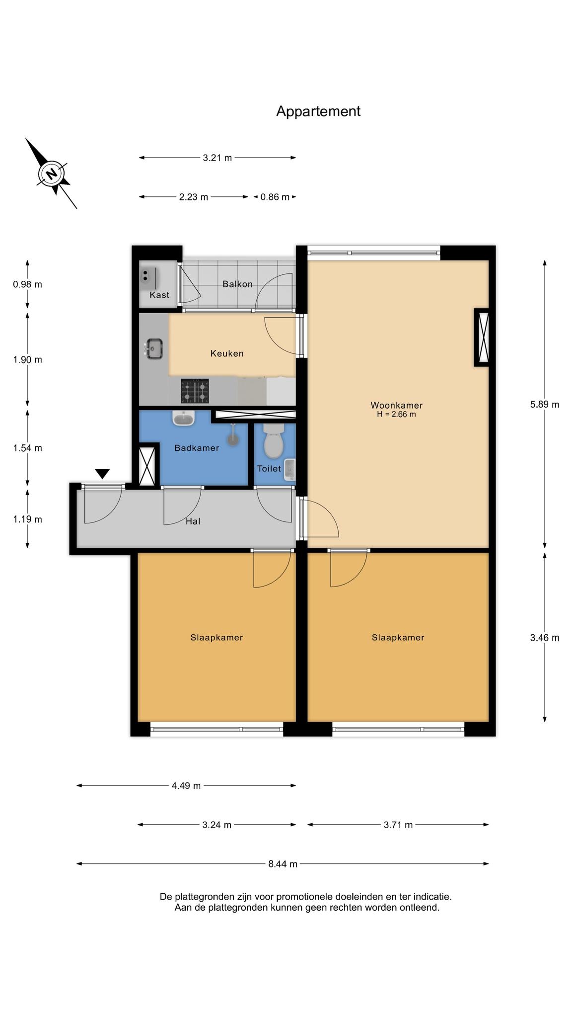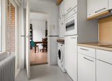 Entree naar het appartement met een ruime hal, badkamer met douche en wastafel, apart toilet met fonteintje, slaapkamer één en toegang tot de woonkamer. De woonkamer heeft vrij uitzicht en ligt aan de voorzijde van het appartement met een deur naar slaapkamer twee aan de achterzijde en naar de keuken aan de voorzijde. De dichte keuken heeft enkele inbouwapparatuur en toegang tot het balkon. De cv-ketel zit in een kastruimte toegankelijk vanaf het balkon.