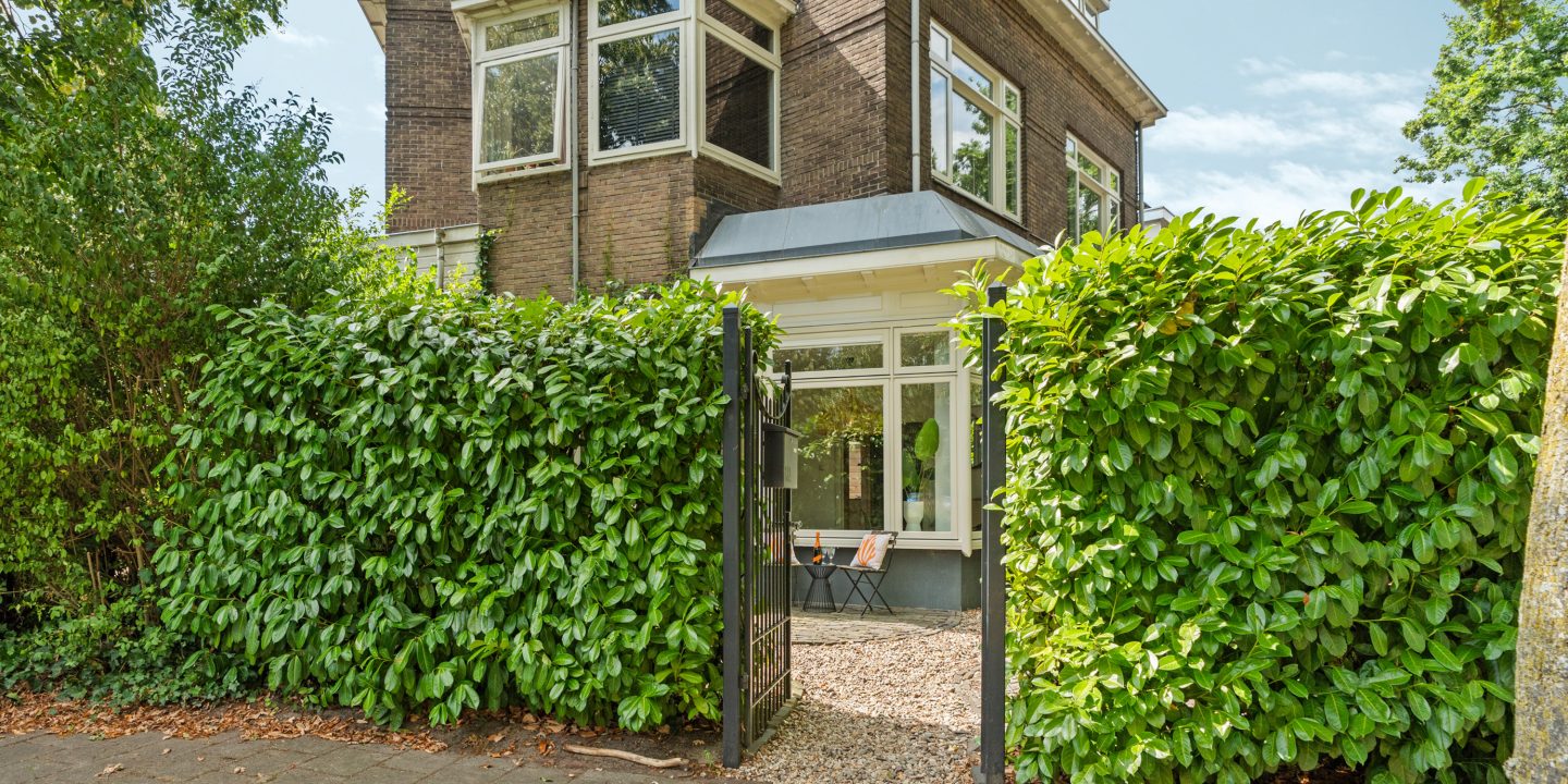 Via de poort aan de voorzijde loop je door de voortuin naar de entree. In de hal vind je de meterkast en heb je toegang tot de sfeervolle, lichte woonkamer en suite. Deze is ingedeeld in een woon- en eetgedeelte, voorzien van meerdere inbouwkasten en een royale erker. Dankzij de hoge raampartijen valt er volop daglicht binnen. De tuin aan de voorzijde wordt omringd door een hoge heg, waardoor je veel privacy hebt.