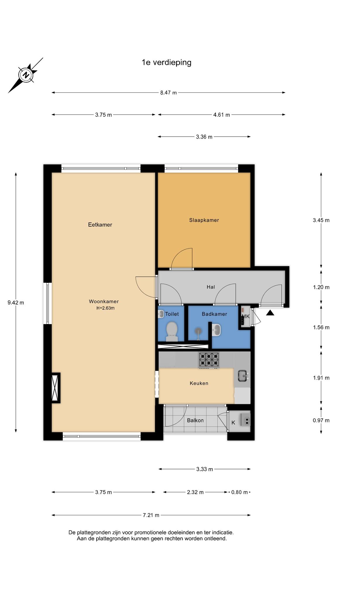 De indeling is als volgt: Bij binnenkomst kom je eerst in de ruime hal met aan de linkerzijde de badkamer met inloopdouche en een wastafel en een separaat toilet. Aan de linkerzijde van de hal bereik je de slaapkamer en vervolgens bereik je de ruime doorzon woonkamer. Vanuit de woonkamer loop je verder naar de keuken, welke beschikt over een koelkast, 5-pits gaskookstel met ruime oven en een afzuigkap. Verder is er ook een witgoedaansluiting. Het appartement beschikt over een fijn balkon welke toegankelijk is via de keuken.