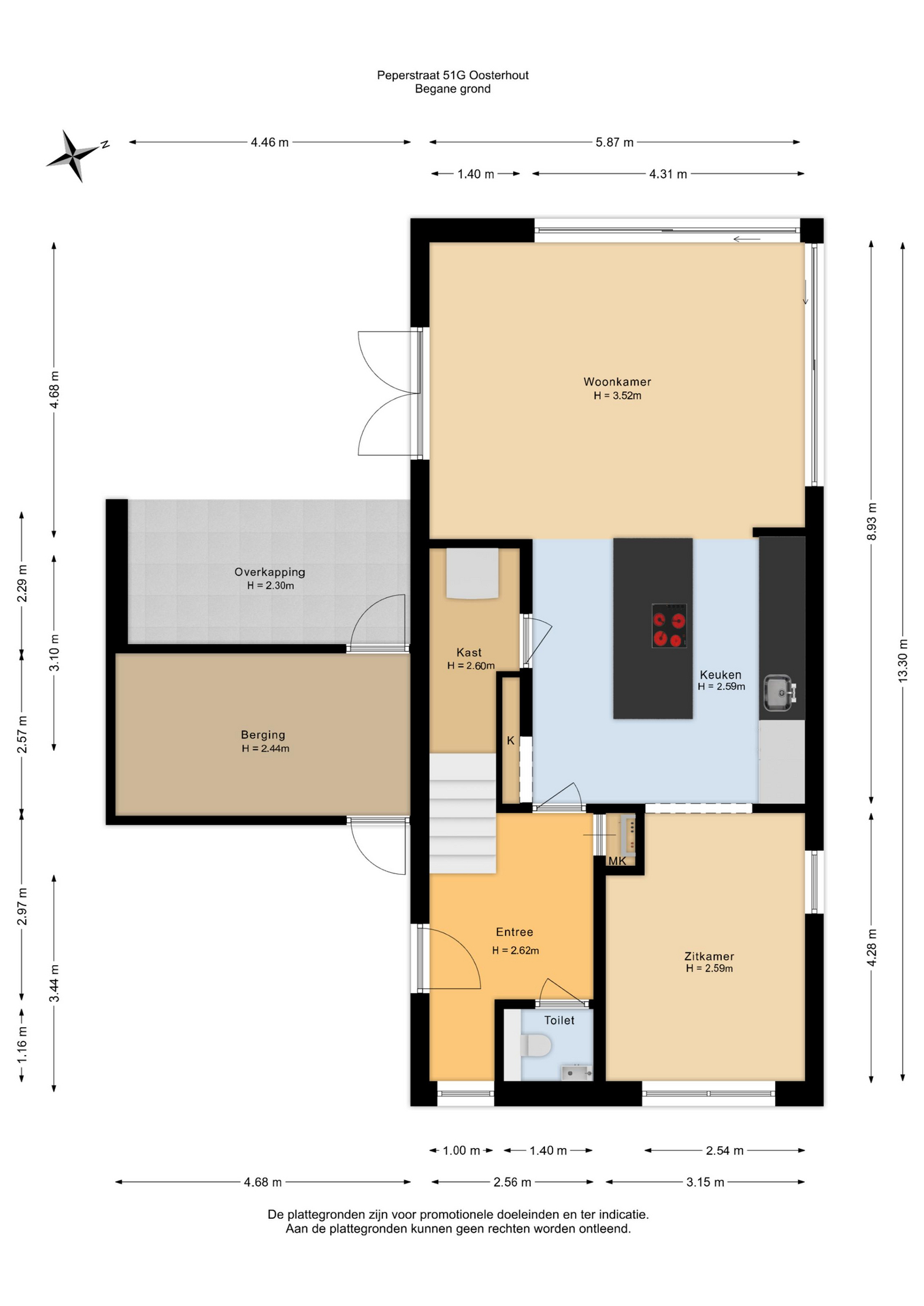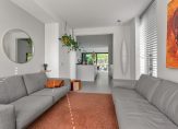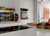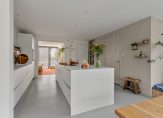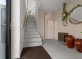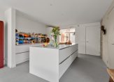 Binnenkomst in een ruime hal met toilet, meterkast, trapopgang en toegang tot de woonkamer. De lichte, open living is ingedeeld met een designkeuken inclusief kookeiland met inductiekookplaat en geïntegreerde afzuiging, Corian werkblad, hete-luchtoven, koel-vriescombinatie en vaatwasser.