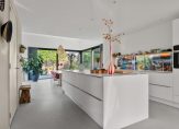 Grenzend aan de keuken ligt de eetkamer met verhoogd plafond, die via openslaande deuren en een schuifpui toegang biedt tot de zonnige, op het zuidoosten gelegen tuin. Aan de andere zijde van de keuken bevindt zich een gezellige zit-/werkkamer.