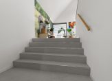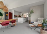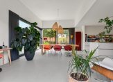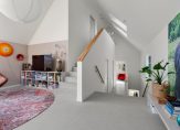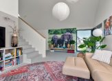 Enkele treden hoger ligt een indrukwekkende multifunctionele ruimte, met hoge plafonds en veel lichtinval.