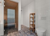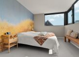 Via de rechte trap kom je op een lichte overloop. Hier bevinden zich een ruime slaapkamer met grote raampartijen en uitzicht op de dijk, een tweede slaapkamer/waskamer en een luxe badkamer met sauna, dubbele wastafel, toilet en inloopdouche.