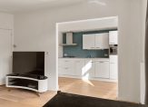 Het appartement ligt op de eerste verdieping. Op de overloop is er ook een opslagruimte te vinden voor o.a. je stofzuiger. Via de voordeur kom je in de woonkamer. De woonkamer is erg licht door de grote pui aan de achterzijde en de verbinding met de open keuken. De keuken beschikt over een wasmachine, vaatwasser, gasplaat, afzuigkap, koelkast en combimagnetron. Via de keuken is het toilet te bereiken. Verder ligt het balkon op de zon en is deze op twee manieren te bereiken. Via de keuken maar ook via de schuifpui vanuit de woonkamer.